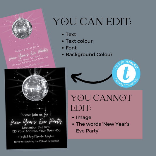 • 2024 New Year Eve disco ball invite instant download, Editable holiday inv, Evite ,5x7, 4x6, Edit with TEMPLETT, New Years Party, XM021