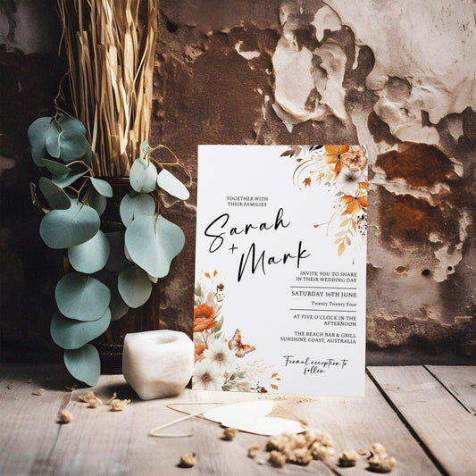 Watercolour Terracotta Wedding Fall Floral Customisable Wedding Template ,Terracotta Rose Card , Edit with TEMPLETT, 4x6, 5x7, evite WM003