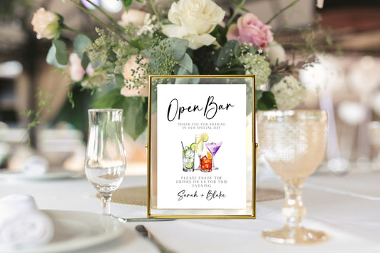 Watercolour cocktails open bar menu, 8x10 Editable table sign, wedding drink sign, bar menu template, modern bar sign, wedding table signs