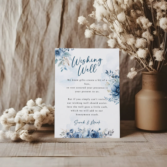 Watercolour Dusty Blue Wedding Wishing Well Card Template, 8x10 Editable Sign, Blue Floral Wedding Card, Bridal Sign, Gift Request, WM006