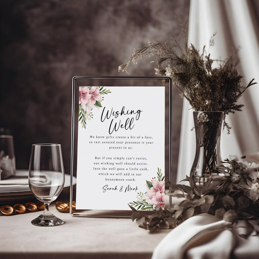 Wishing Well Template, Editable Watercolour pink florals, Customisable Spring wedding table sign, Lily flowers, Garden wedding, 8x10 WM002