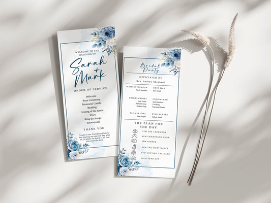 Wedding program editable invitation, Dusty Blue Floral Wedding Stationery, Easy to edit template, wedding schedule, 4x9, Custom DIY, WM006