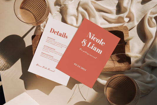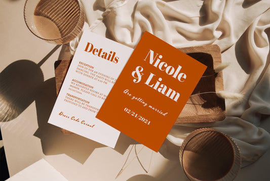 Burnt Orange Retro Wedding Invitation and details card template bundle, Modern Minimalist Editable Invite, Bold color, TEMPLETT, BW001
