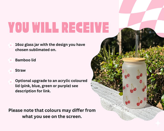 Cherry blossom 16oz frosted glass with bamboo lid and clear straw, sublimated vibrant design, Iced latte glass cup, latte jar, reusable mug
