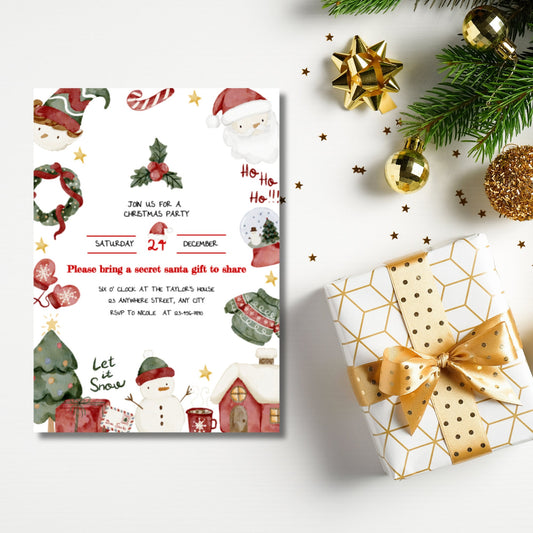 Digital Christmas party printable invitation, Kids editable Xmas invite, watercolour winter christmas,Holiday party,Edit with TEMPLETT,XM004