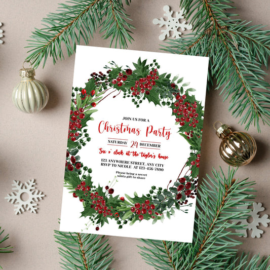 Digital Christmas wreath invitation, editable Xmas invite, minimal modern Holiday party, Printable Christmas dinner,Edit with TEMPLETT,XM010