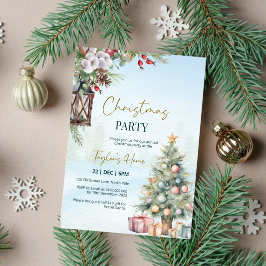 Digital Christmas party printable invitation, editable Xmas tree invite, watercolour winter christmas,Holiday party,Edit with TEMPLETT,XM005