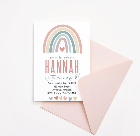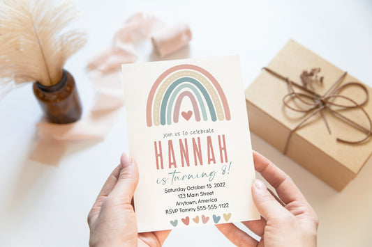 Editable ANY AGE Boho Rainbow Birthday Invitation and RSVP Card Bundle, 8th birthday, custom template, digital download, evite, 4x6, 5x7