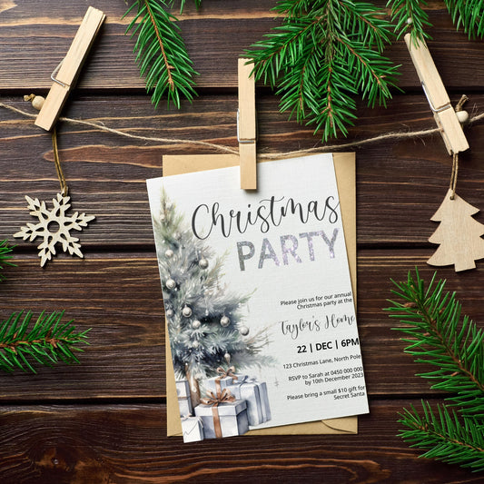 Editable Christmas party digital template, Downloadable work party invite, silver watercolour boho tree printable, Edit with TEMPLETT,XM003