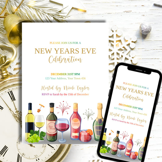 Editable Colorful New Year Cocktails Party Bundle , DIY Printables for a Vibrant Celebration, Festive NYE Invitations, Welcome sign, XM022