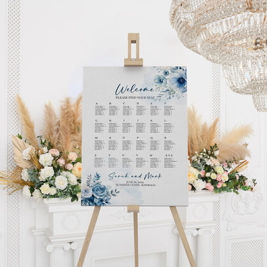 Dusty blue floral seating plan template, minimalist Spring wedding theme, Large editable sign, easy to customise design, Seat chart, WM006