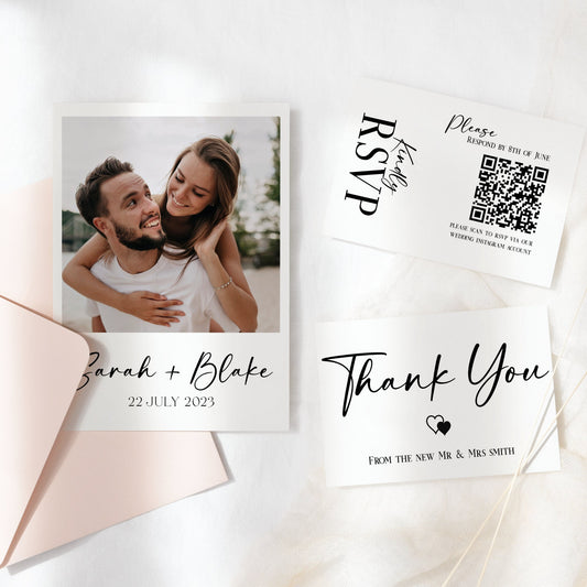 Photo invite, modern minimal wedding ceremony bundle, Stunning custom QR RSVP Code, Easy to edit template, print at home digital downloads