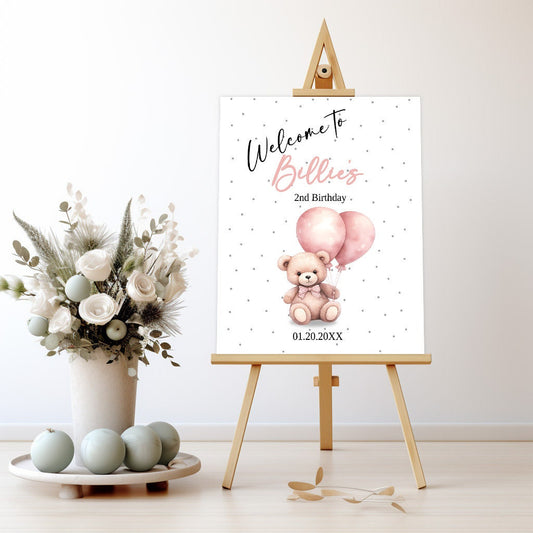 Oh Twodles second birthday Editable welcome sign, watercolor teddybear, Girl 2nd birthday party, Pink balloon bear, 2nd Birthday, CB001