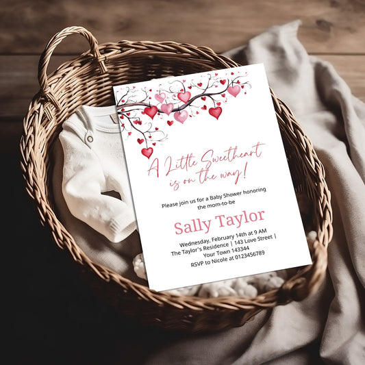 Pink tree heart leaves Valentines baby shower invite, Little Sweetheart Valentines Day editable template, Instant Download, VB001