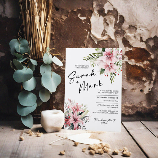 Pink Lily Wedding Invitation, Spring Wedding, Gorgeous floral wedding card, flower clipart, foliage, outdoor nuptials, 5x7, 4x6, Evite WM002