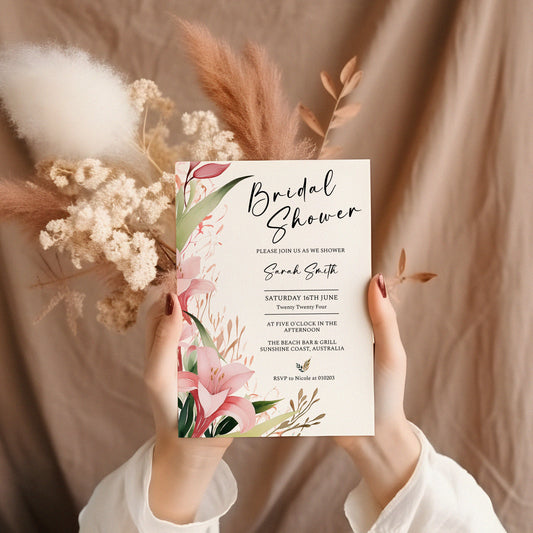 Pink Lily Bridal Shower Invitation, Spring Wedding, Gorgeous floral wedding, pink flowers, foliage, outdoor nuptials, 5x7, 4x6, Evite WM002