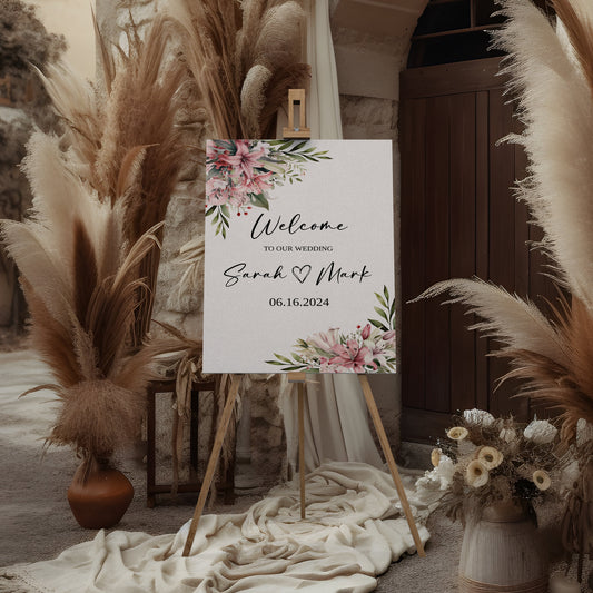 Pink Lily Wedding Welcome Sign, Large Sign, Spring Wedding, Gorgeous floral wedding sign, flower clip art, foliage, outdoor nuptials WM002